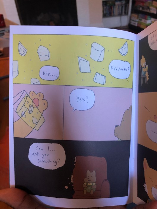 Visiting, Alivia Horsley. A short, beautiful tale about family and the conversations we consciously avoid. Horsley tells a story about a young man who is sent by his mother to visit his aunt and uncle. He is there to reconnect with family. He is also there for another reason. Horsley’s art is simple and effective and her dialogue is naturalistic and perfectly constructed.